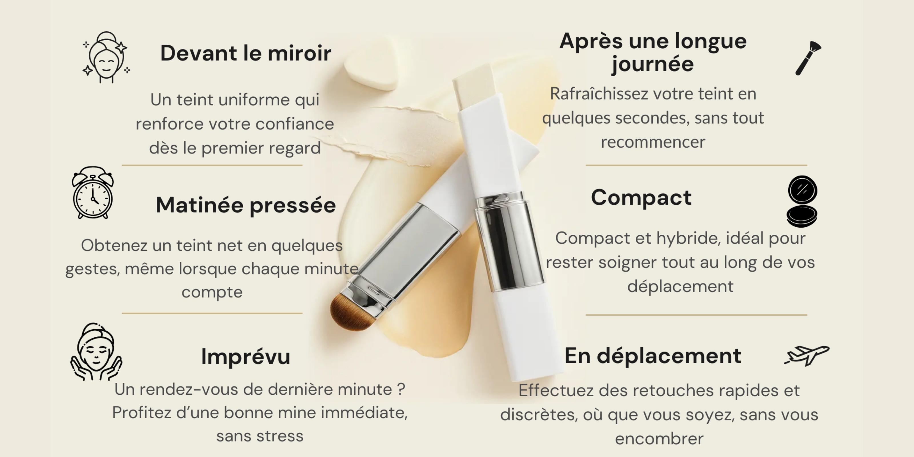 Le vrai avantage pour moi, c’est le gain de temps. Un seul produit, pas besoin de pinceaux en plus, et le rendu reste naturel toute la journée. Parfait quand on veut quelque chose de simple mais propre.